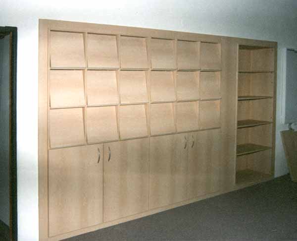 Archivschrank Ausführung · komplett in Buche, · frontseitigeAblage, schwenkbar mit dahinterliegendem Stauraum