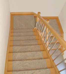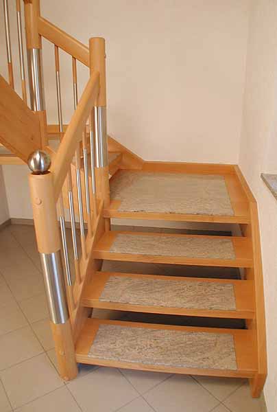 Massivholztreppe mit Zwischenpodesten Ausführung · 2 x 1/4 gewendelt komplett in Buche · flächenbündig eingelassene Graniteinlagen · Geländer Holz/Edelstahl kombiniert
