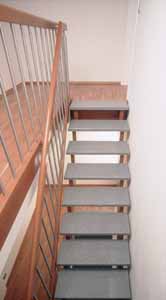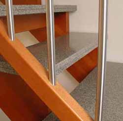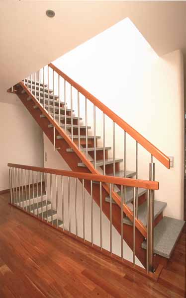 Treppe mit aufgesattelten Granitstufen Ausführung · Holzteile in Buche, Kirschbaum gebeizt · Stufen Granit